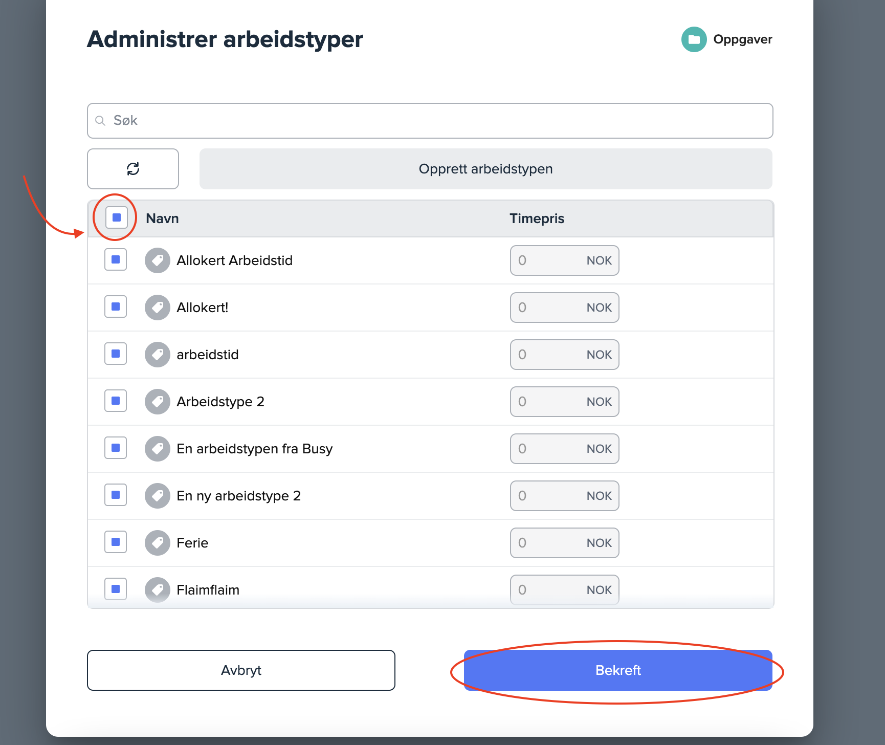 For å velge alle arbeidstyper huker du av firkanten ved siden av «Navn», markert i bildet under. Trykk deretter på «Lagre».