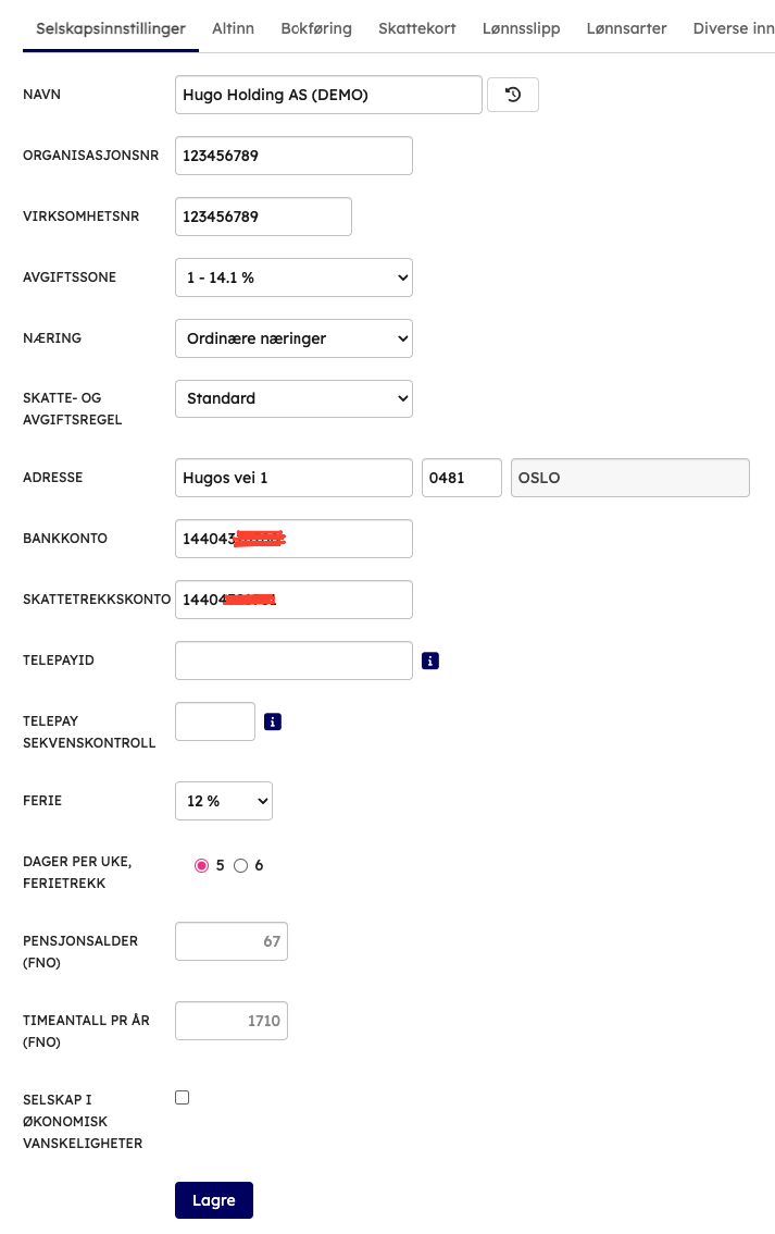 2. Gå gjennom selskapsinnstillingene. Fyll inn organisasjonsnummer, virksomhetsnummer, avgiftssone for arbeidsgiveravgift, skatte- og avgiftsregler, bankkonto og skattetrekkskonto 11 siffer, samt feriepengeprosent på selskapsnivå.