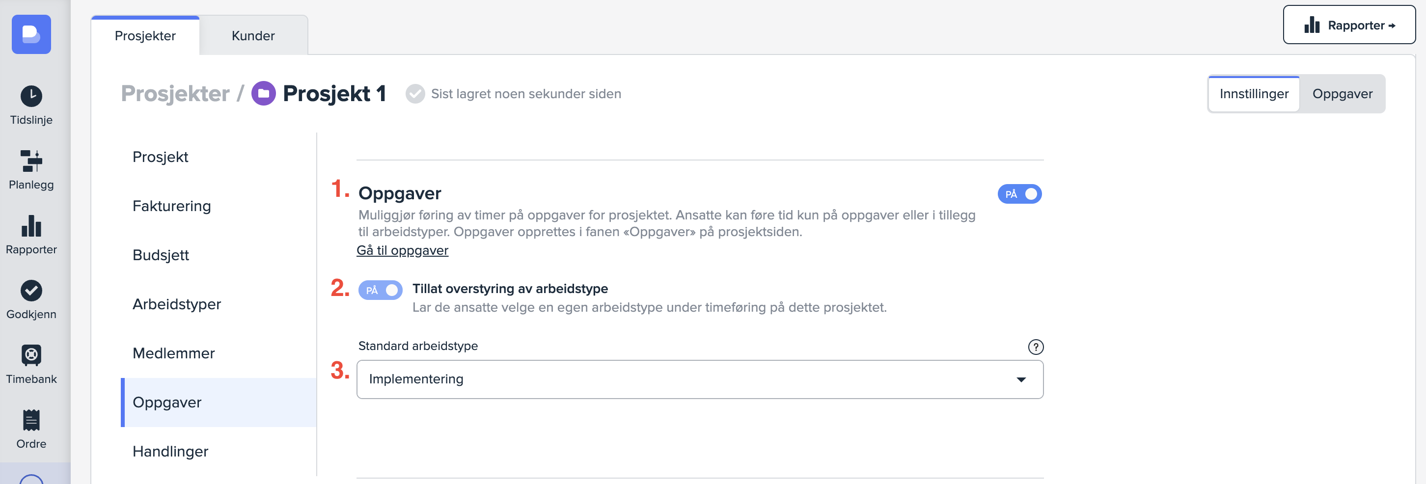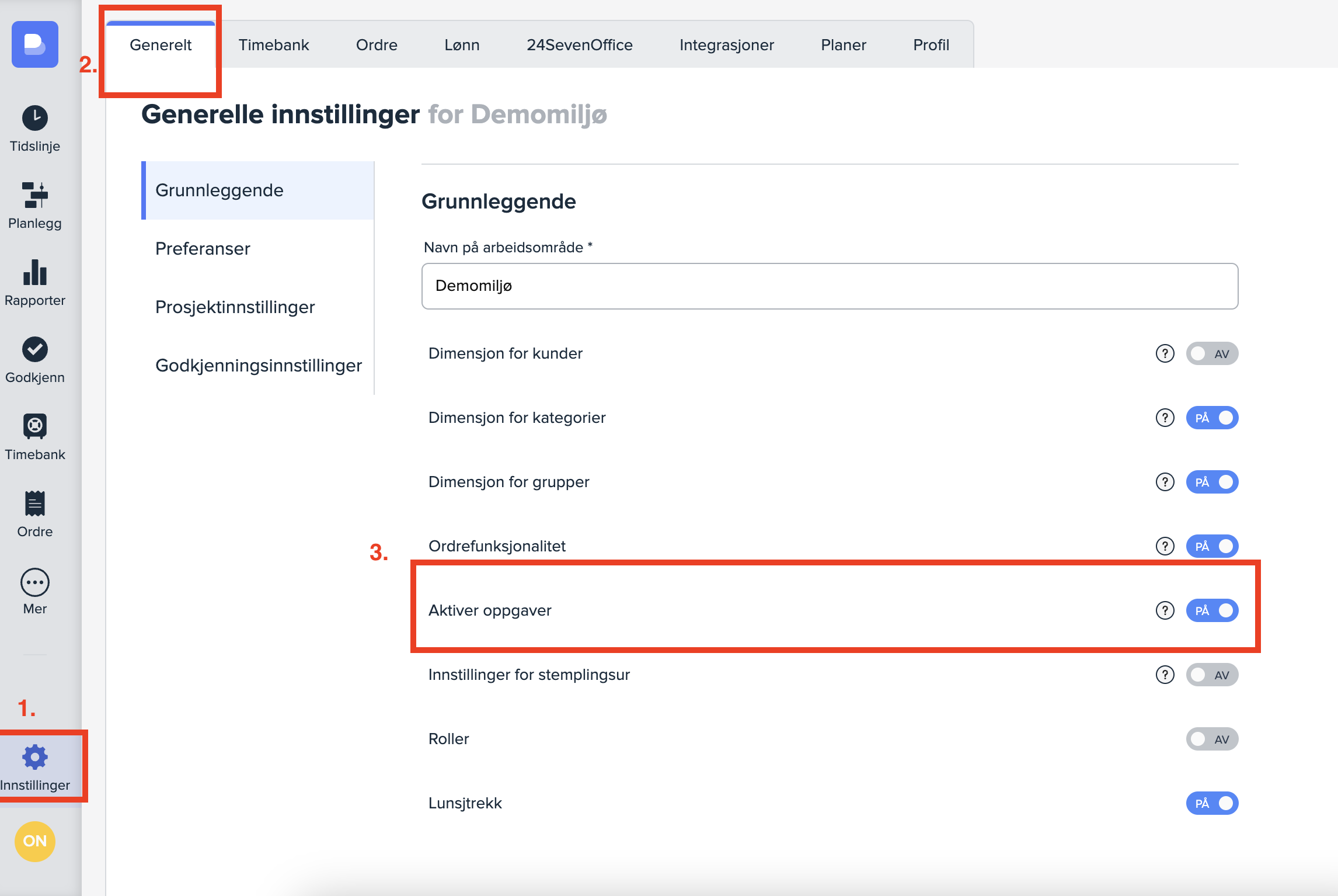 For å kunne føre tid på oppgaver på prosjekter i Busy må du først aktivere oppgaver under «Innstillinger» (1) -> «Generelt» (2). Det gjør du under Grunnleggende innstillinger, ved å skru på «Aktiver oppgaver» (3).
