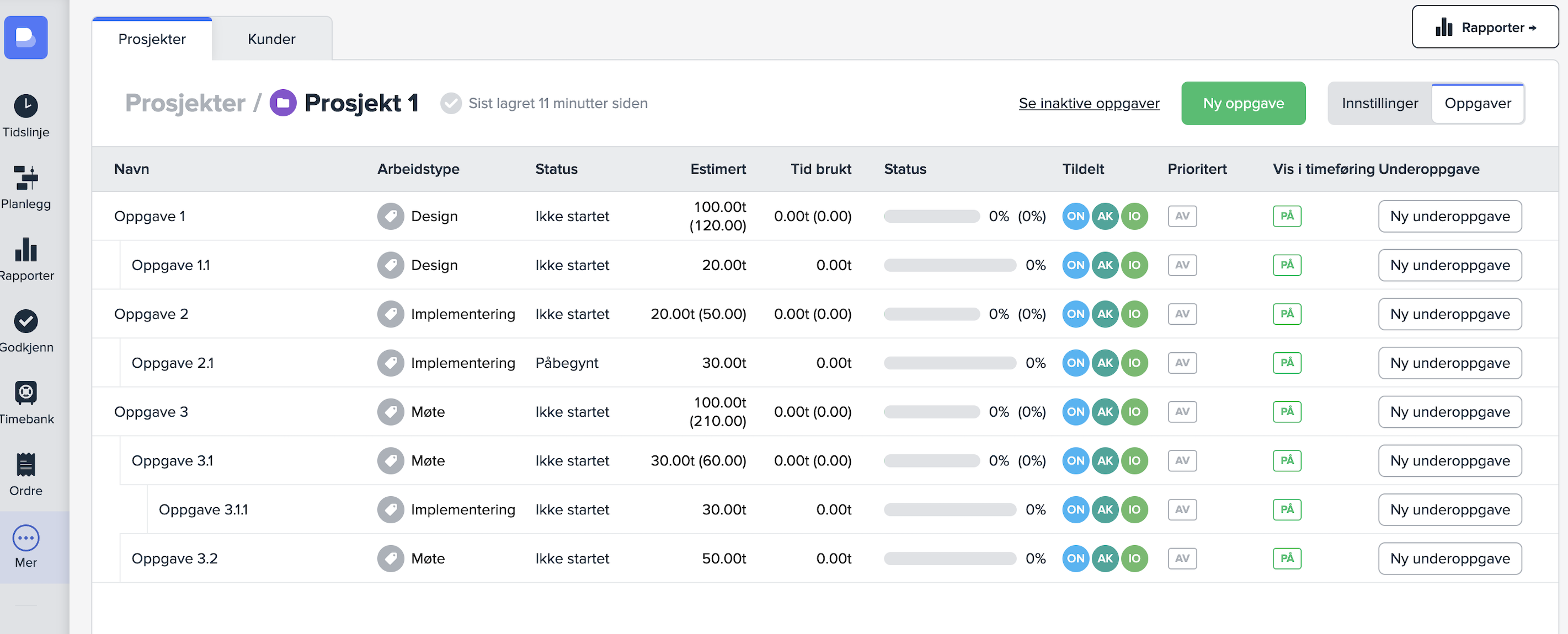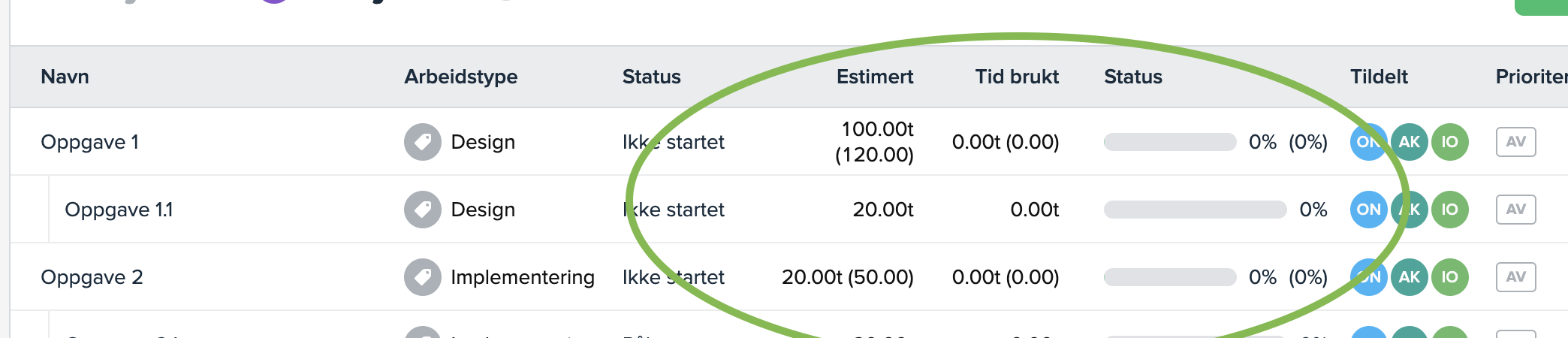 Dette gjelder både på estimert tid, tid brukt og status (%).