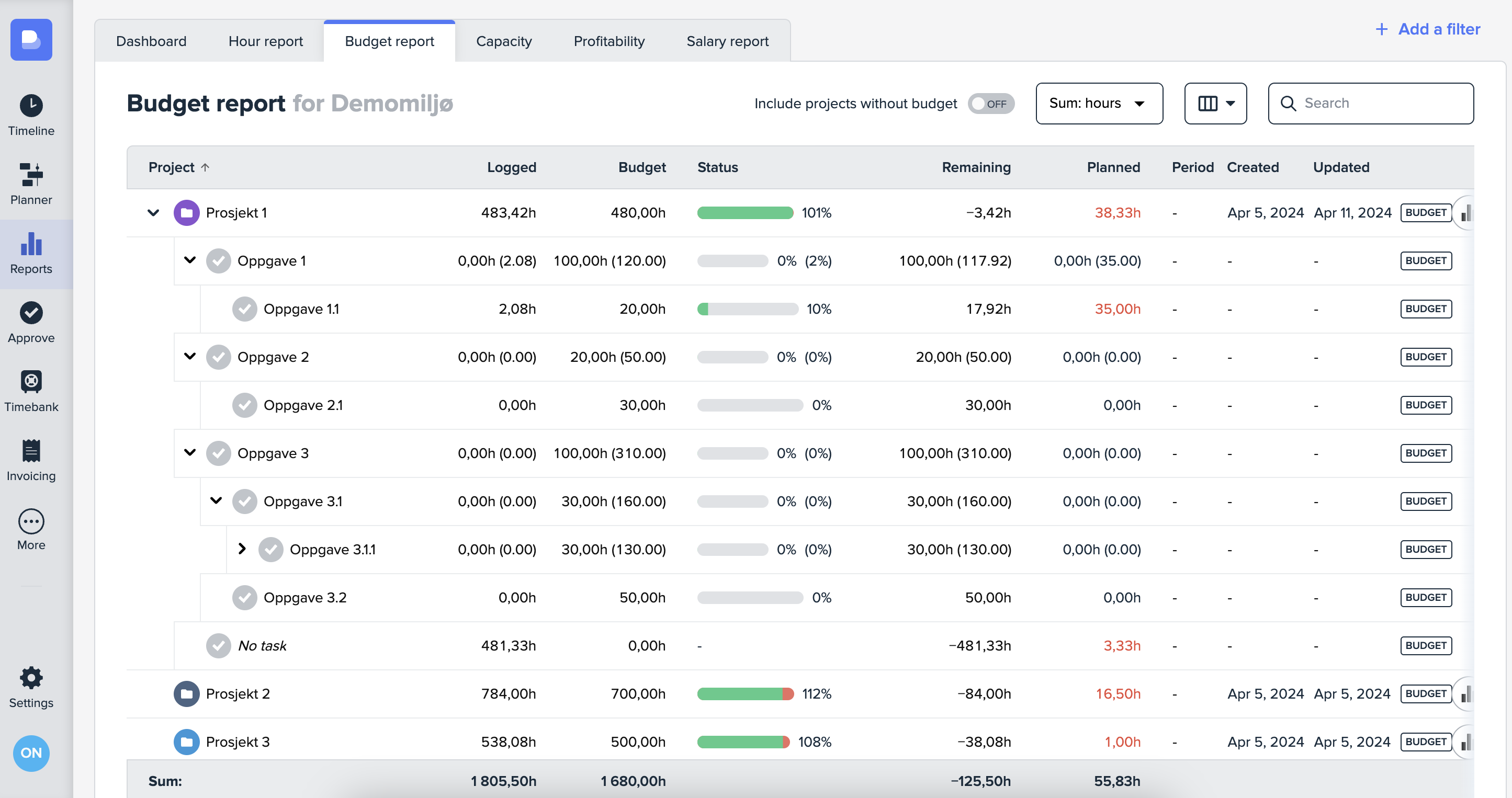 I budsjettrapporten vil prosjekter som er budsjettert etter oppgaver kunne ekspanderes på alle undernivåer. Du kan se status fra underoppgavene, opp til hovedoppgavene og opp til det overordnede budsjettet for prosjektet (basert på summen av estimert tid på alle oppgaver).