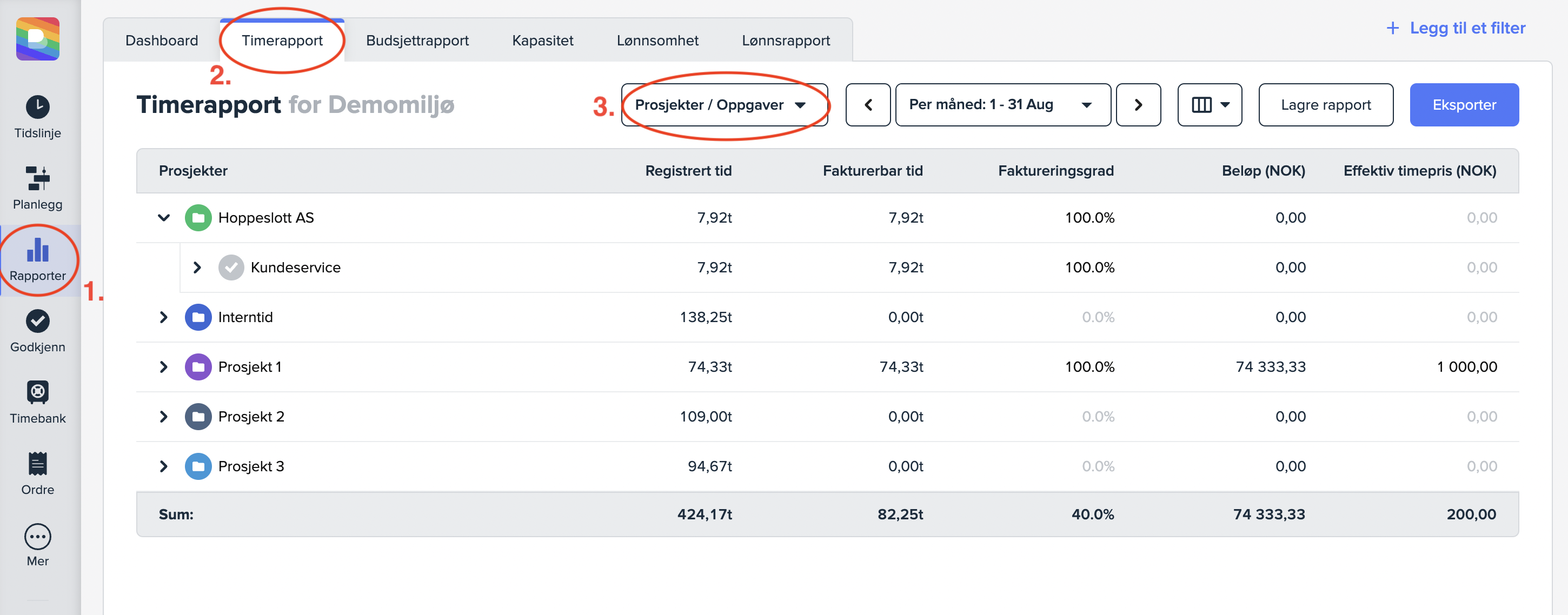 For å se tidsbruk på oppgaver kan du gå til «Rapporter» (1), «Timerapport» (2) og bytte visning til «Prosjekter / Oppgaver» (3). Da vil du kunne ekspandere linjene for å se oppgavene ført per prosjekt. Du kan også bytte visning til brukere, slik at du kan se hvem som har jobbet på de ulike oppgavene.