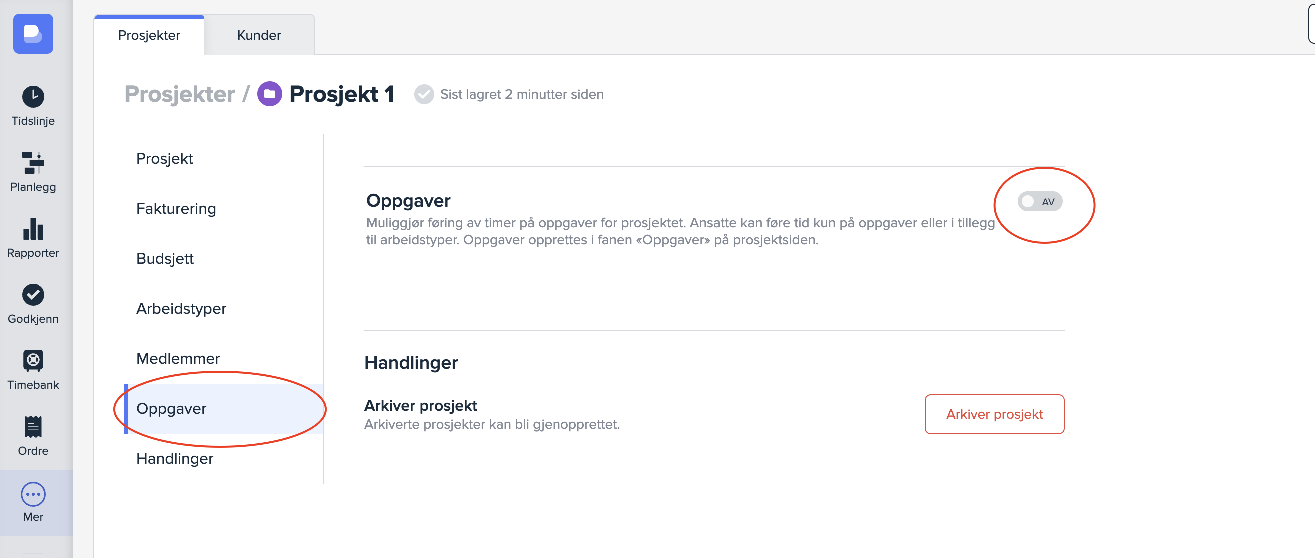 Om du ønsker å gjøre et eksisterende prosjekt oppgavestyrt kan du trykke på «Oppgaver» i sidemenyen inne i prosjektinnstillingene. Skru deretter knappen ved siden av Oppgaver til «på».