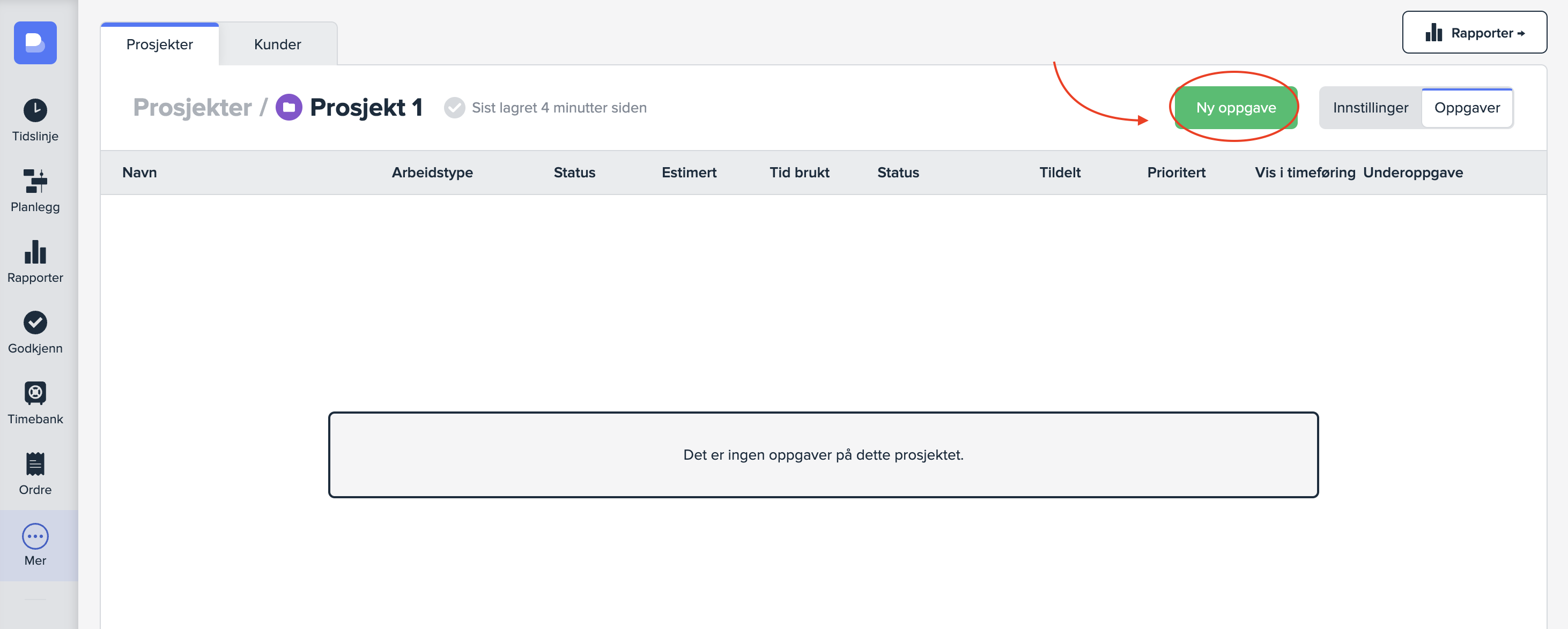 Når du har aktivert oppgaver på prosjektet får du tilgang til en ny side som heter «Oppgaver» oppe til høyre.