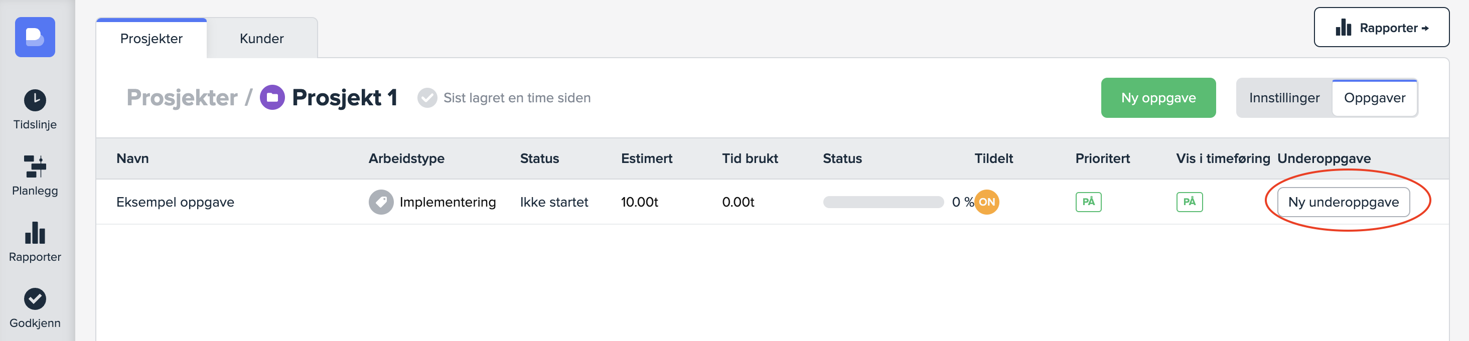 Du oppretter en underoppgave ved å trykke på «Ny underoppgave» til høyre for en oppgave.