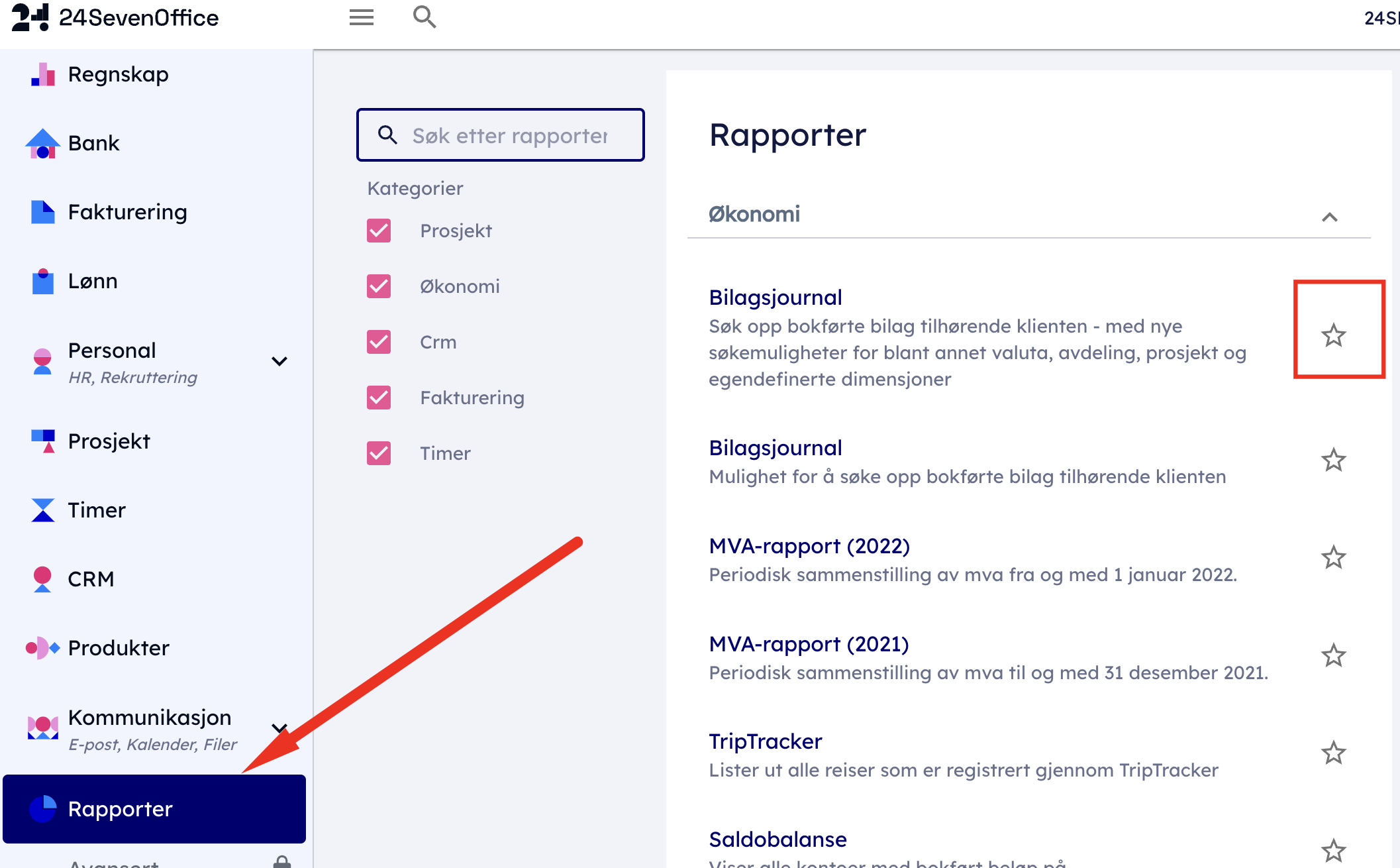 I rapportmodulen i 24SevenOffice finner du en oversikt over alle tilgjengelige rapporter i systemet.
