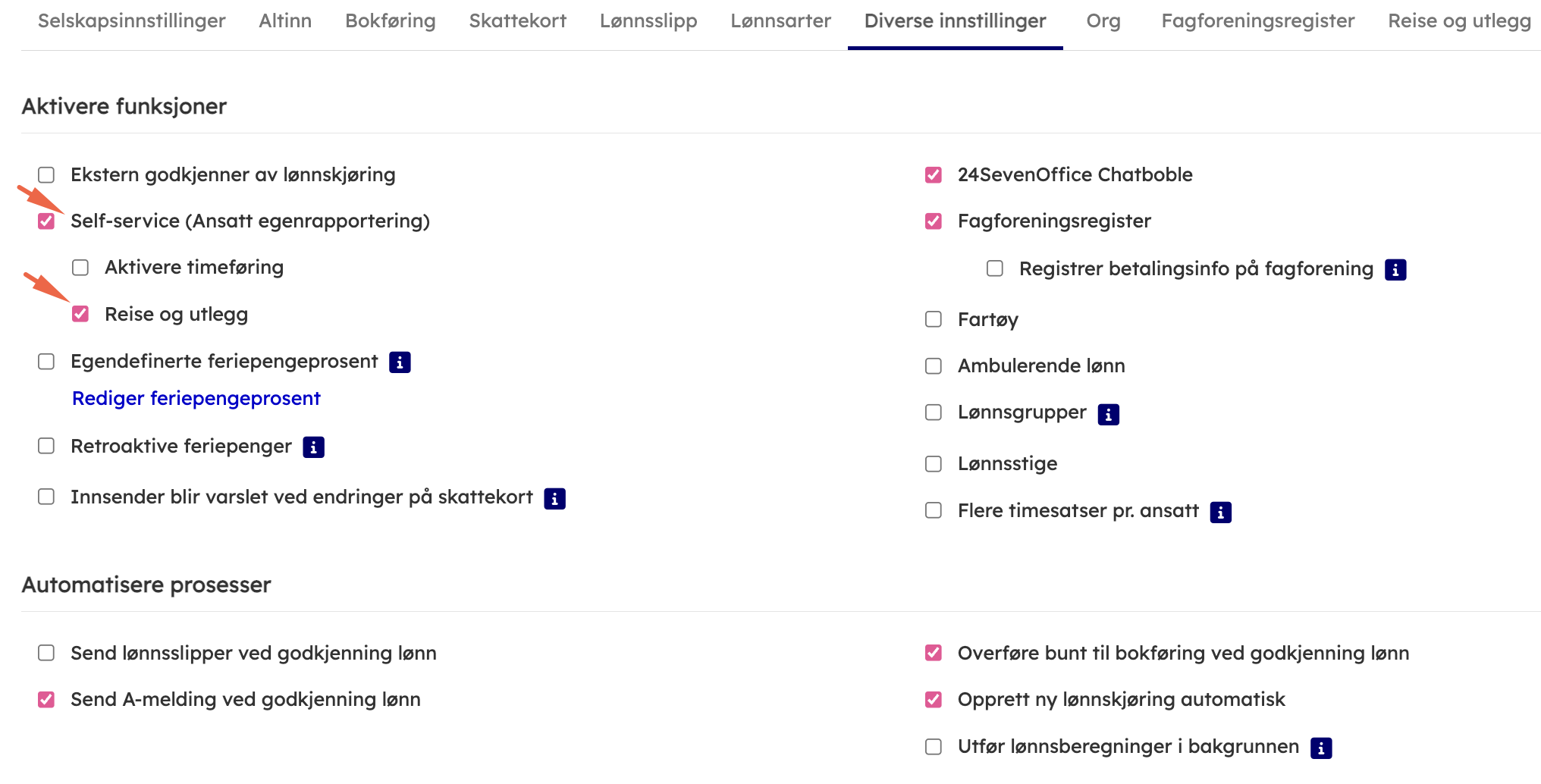 - Aktivér Self-service (ansatt egenrapportering - ansatte får tilgang via https://me.24sevenoffice.com) samt reise og utlegg under Aktivere funksjoner. Aktivering av self-service gjør at de ansatte får reise og utlegg tilgjengelig når de logger seg inn i portalen. Aktivering av reise og utlegg gjør at det dukker opp en ekstra fane under innstillinger for Reise og utlegg.