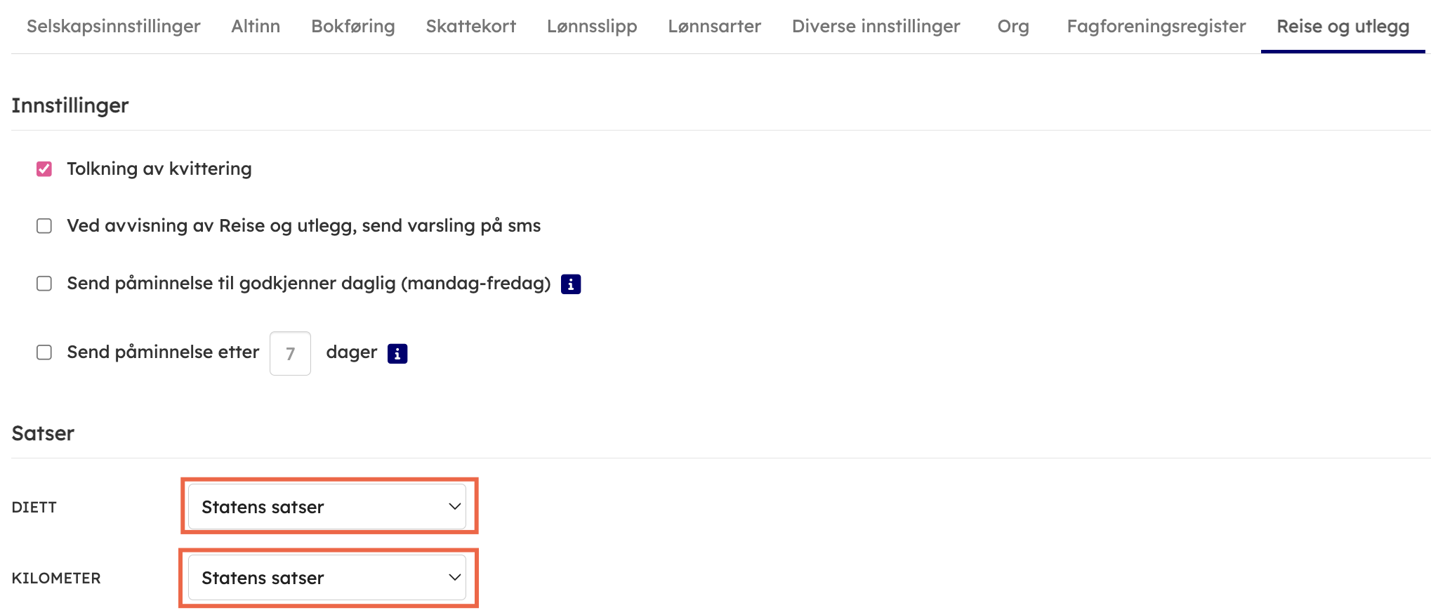 - Velg hvilke satser som skal gjelde ved registrering av både diett- og kilometergodtgjørelse. Dette settes på overordnet nivå for selskapet.
