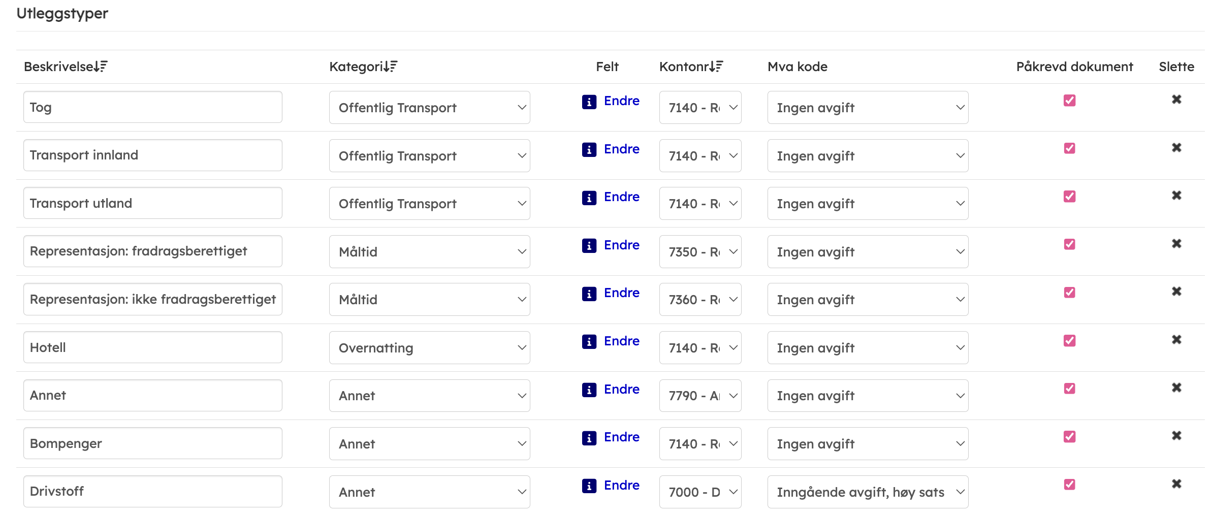 - Kategori sier noe om hvilke felter som blir tilgjengelig for utfylling når en ansatt velger denne utleggstypen. Dette er basert på dokumentasjonskrav. Du kan også endre påkrevde felter selv under endre.