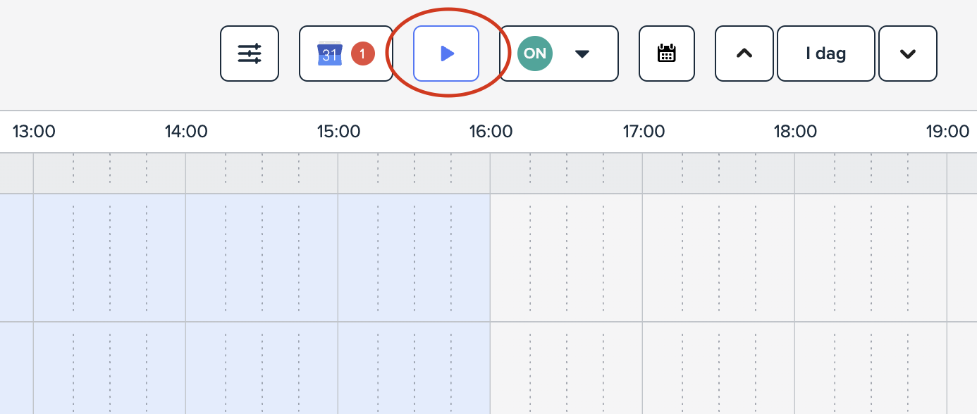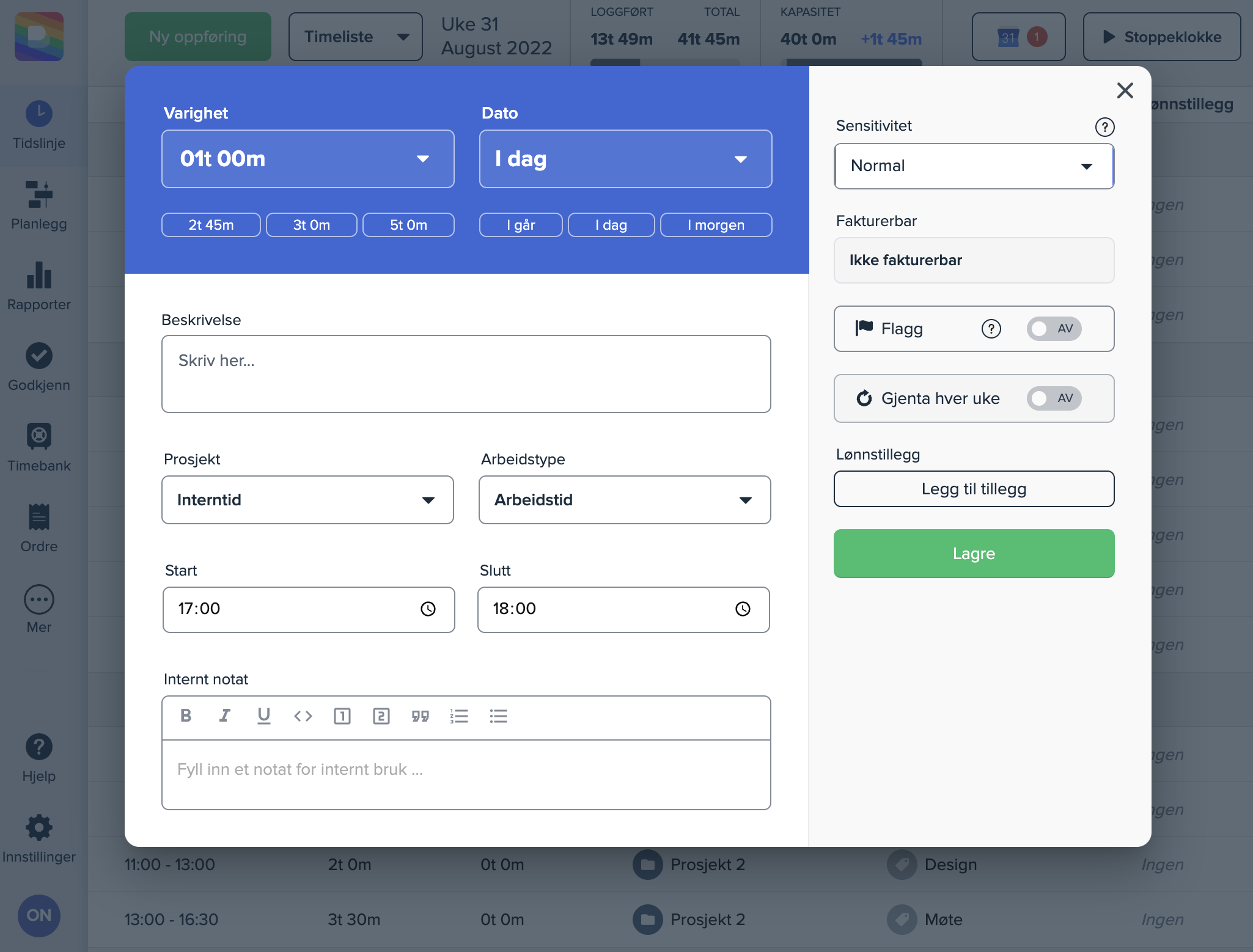 Fra timelisten kan du også trykke på knappen for ny oppføring for å åpne utfyllingsskjemaet. Starttid blir automatisk satt til samme dag som knappen ligger på.