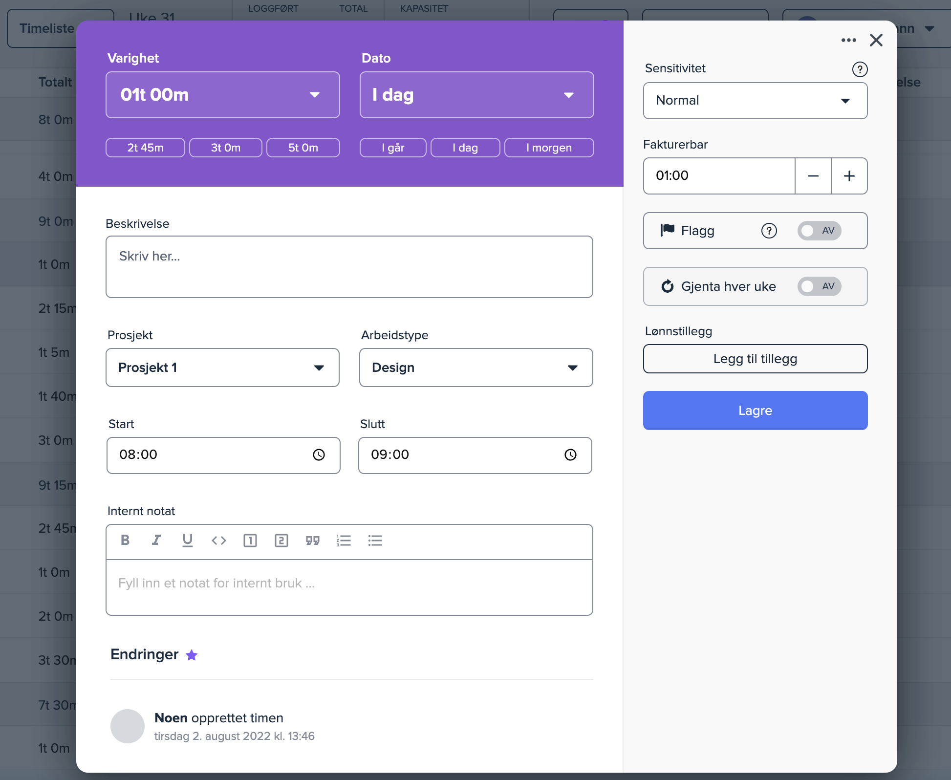 Oppføringer kan endres i timelisten ved å trykke på en rad. Da vil skjemaboksen for valgt oppføring komme frem. Endringer lagres når du trykker på «Lagre».
