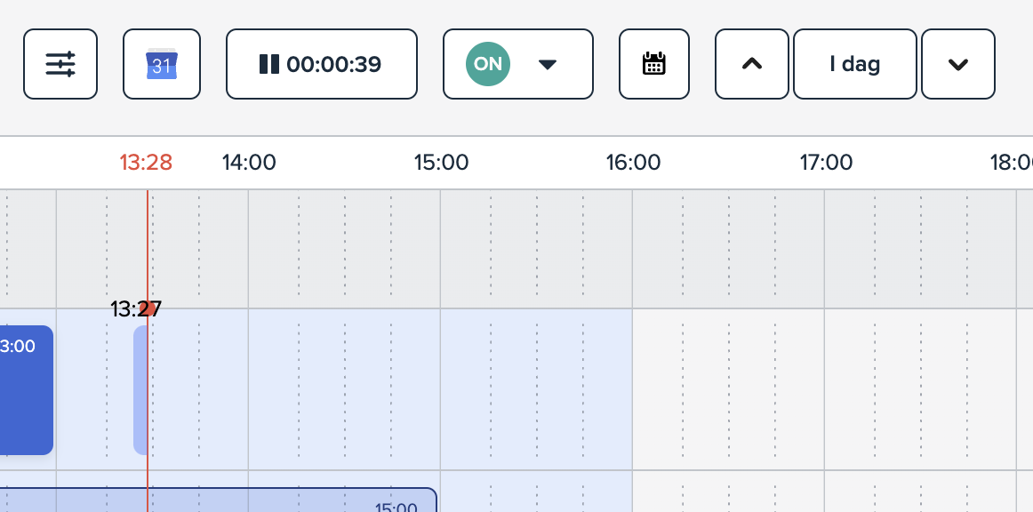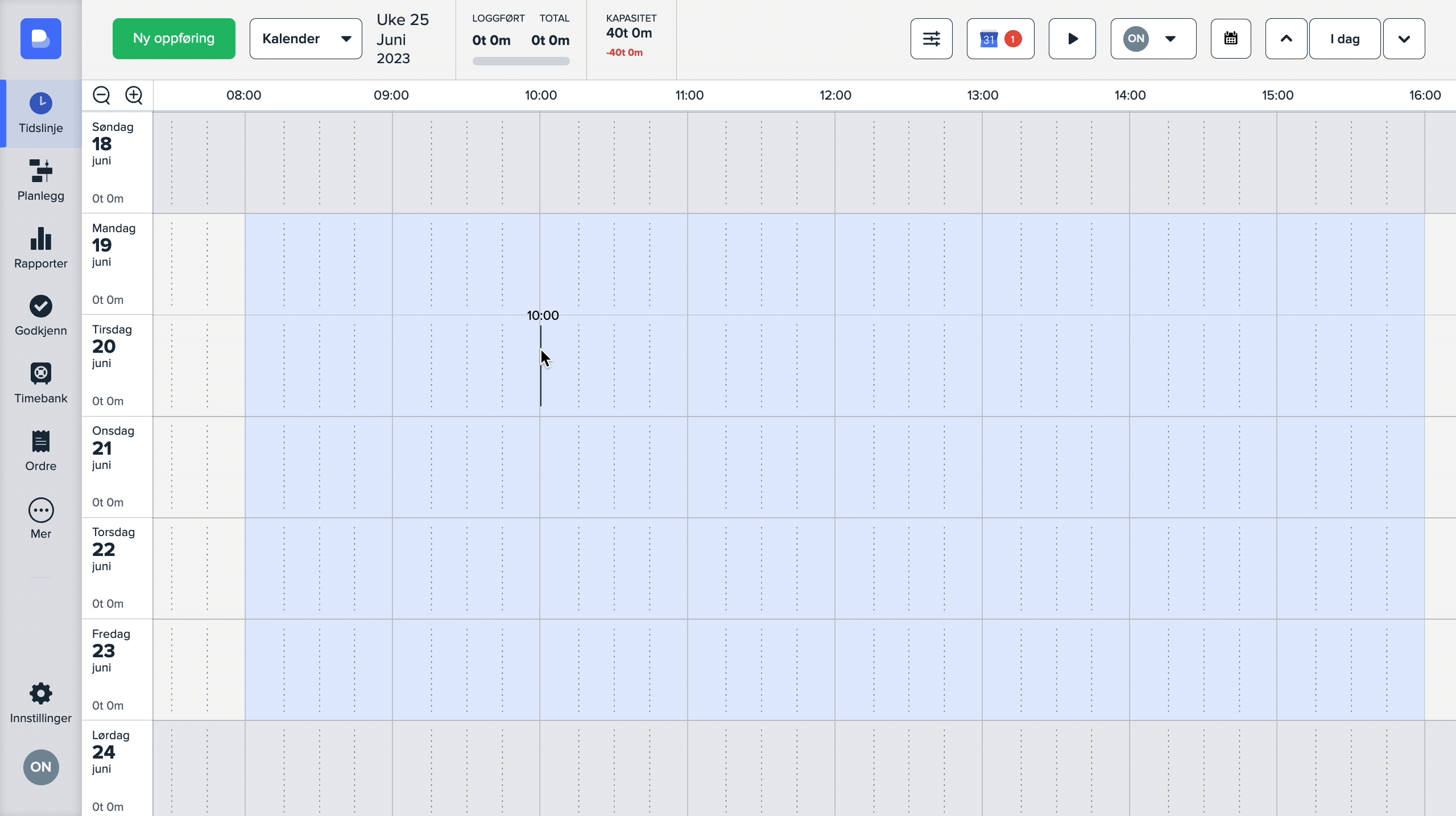 Flytt pekeren til ønsket dag og starttidspunkt. Hold deretter pekeren nede mens du drar den til ønsket sluttidspunkt. Når du slipper pekeren registreres oppføringen, med umiddelbar mulighet for videre utfylling av detaljer.