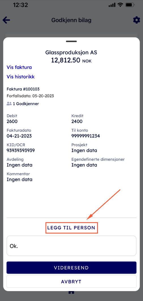 Du kan videresende bilaget til en annen ved å åpne fakturaen, trykk "videresend" og trykk på “legg til person”. Se instruks på bildene under: