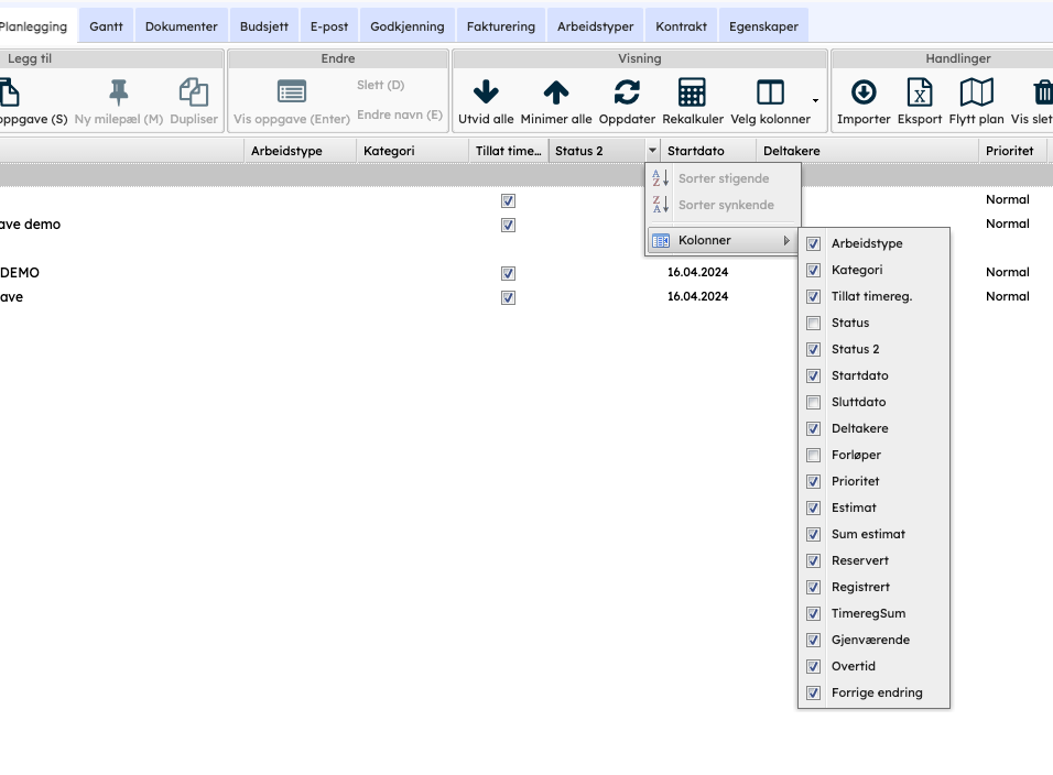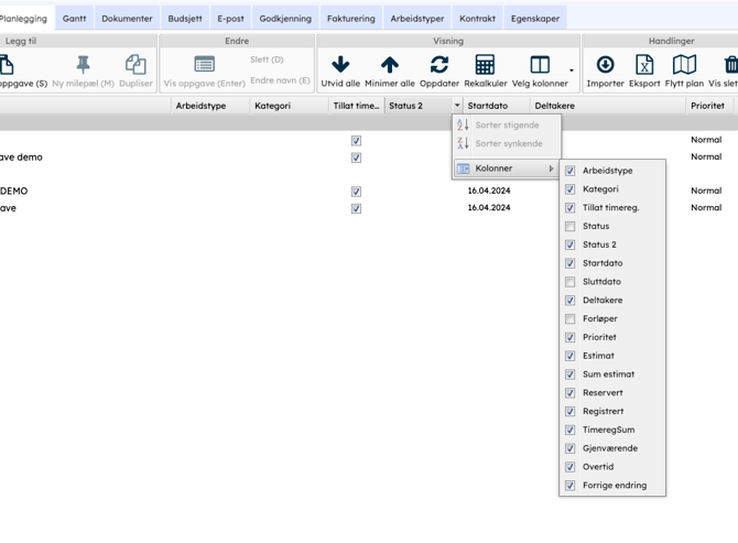 Du har muligheten til å tilpasse hvilke kolonner du ønsker å vise. Det er ikke alle som har behov for alle kolonnene.