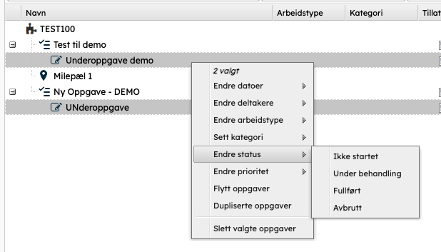 Marker de oppgavene du vil redigere og høyreklikk. Du får da opp de valgene som er mulig å redigere.