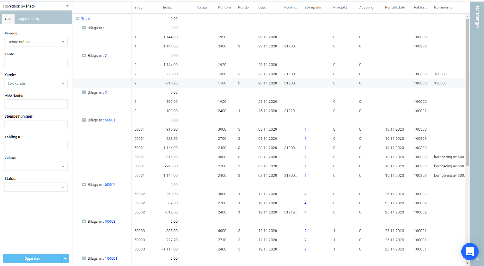Viser hovedbok for inneværende måned aggregert på bilagsnummer - Hovedbok (år)