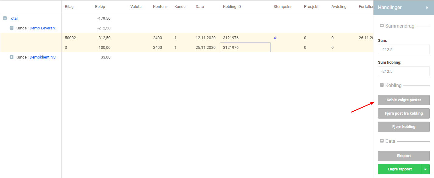 Her vil man kunne se summen til markerte bilag, og eventuell sum tilknyttet en kobling. - Kobling