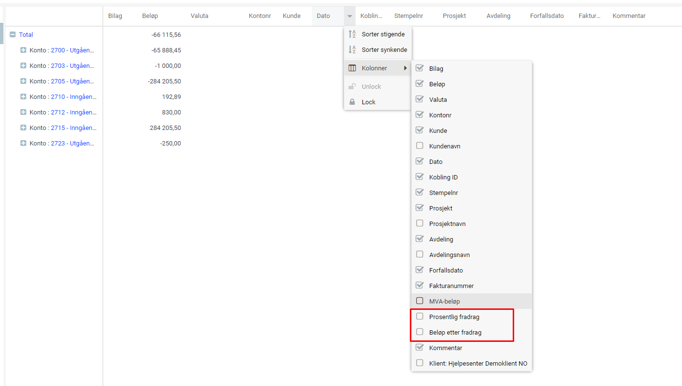 Du kan nå legge til kolonne for prosentvis fradrag og beløp etter fradrag. Du vil da lettere få oversikt over hvilke bilag som har prosentvis fradrag og hva beløpene er etter fradraget.