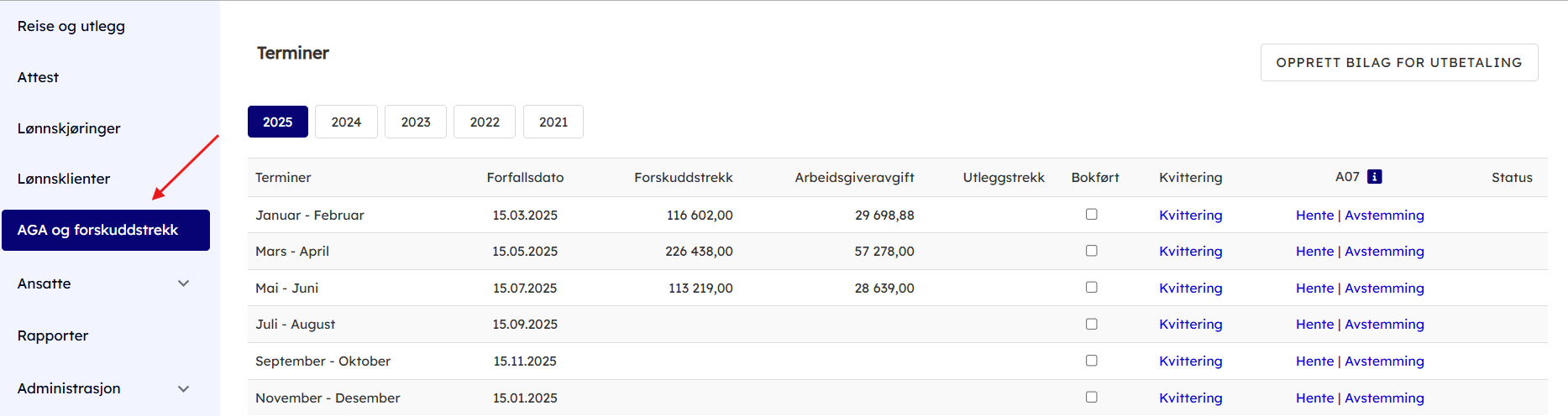 1. Klikk på AGA og forskuddtrekk fra venstremenyen i 24Payroll.