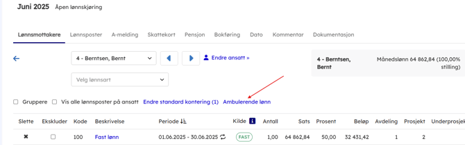 - Gå så til Lønnskjøring → Lønnsmottakere → Velg en ansatt og Klikk på Ambulerende lønn.