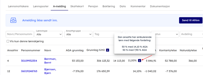 Gå til A-melding fanen og se ekstra tooltip på de personene som har ambulerende lønn. Se fordelingen mellom sonene og hva den effektive prosenten er for arbeidsgiveravgift.