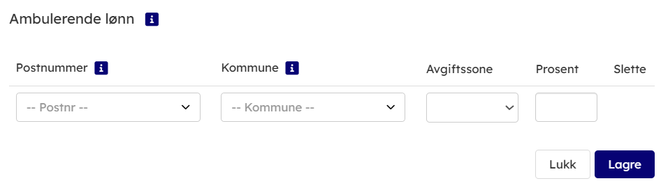 - Søk på en kommune ved å velge i listen, eller skrive inn post-/ kommunenummer eller poststed/kommunenavn. Satsen vil automatisk velges og du kan angi prosentvis andel av arbeidet som er utført i annen sone. Man kan kun ha én sone siden prosent må være større enn 50 for å kvalifisere til ambulerende lønn.