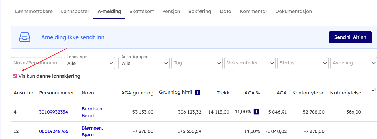 Dersom man har flere lønnskjøringer i samme periode vil beregningen for hele perioden være lik. For å differensiere på lønnskjøringene kan man klikke på “Vis kun denne lønnskjøringen”.