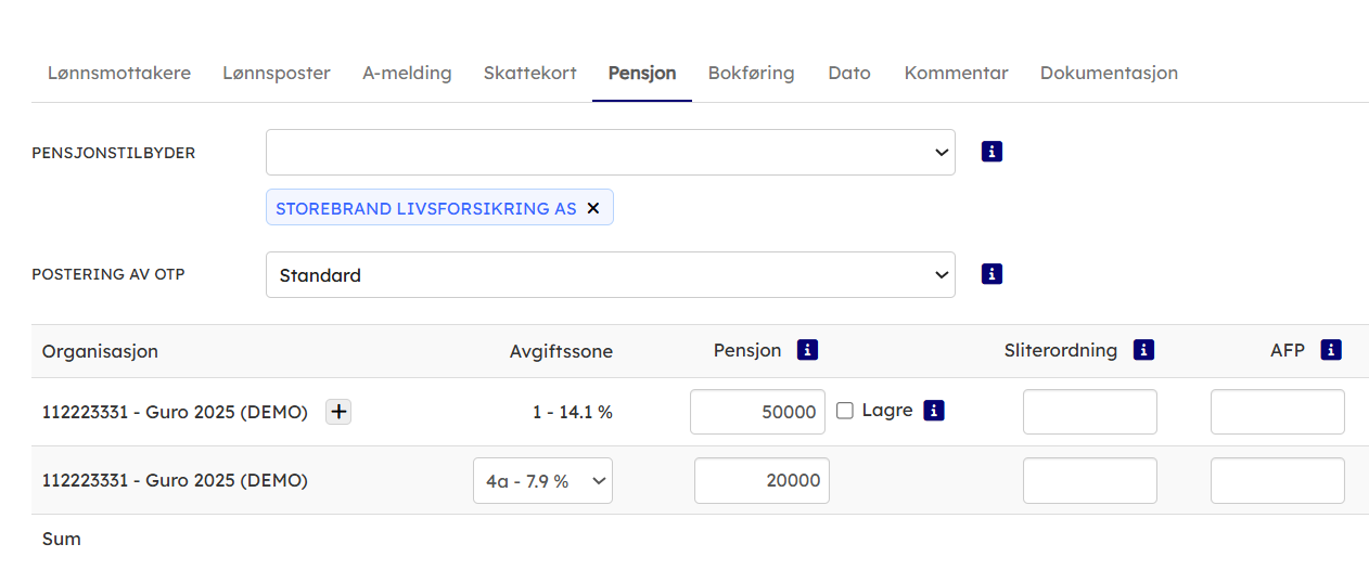 Ambulerende lønn for OTP må manuelt beregnes i pensjonsfanen. Det er støtte for å opprette flere linjer med ulike AGA satser i pensjonsfanen slik at man kan legge inn beløpene pr. aga sone på OTP basert.
