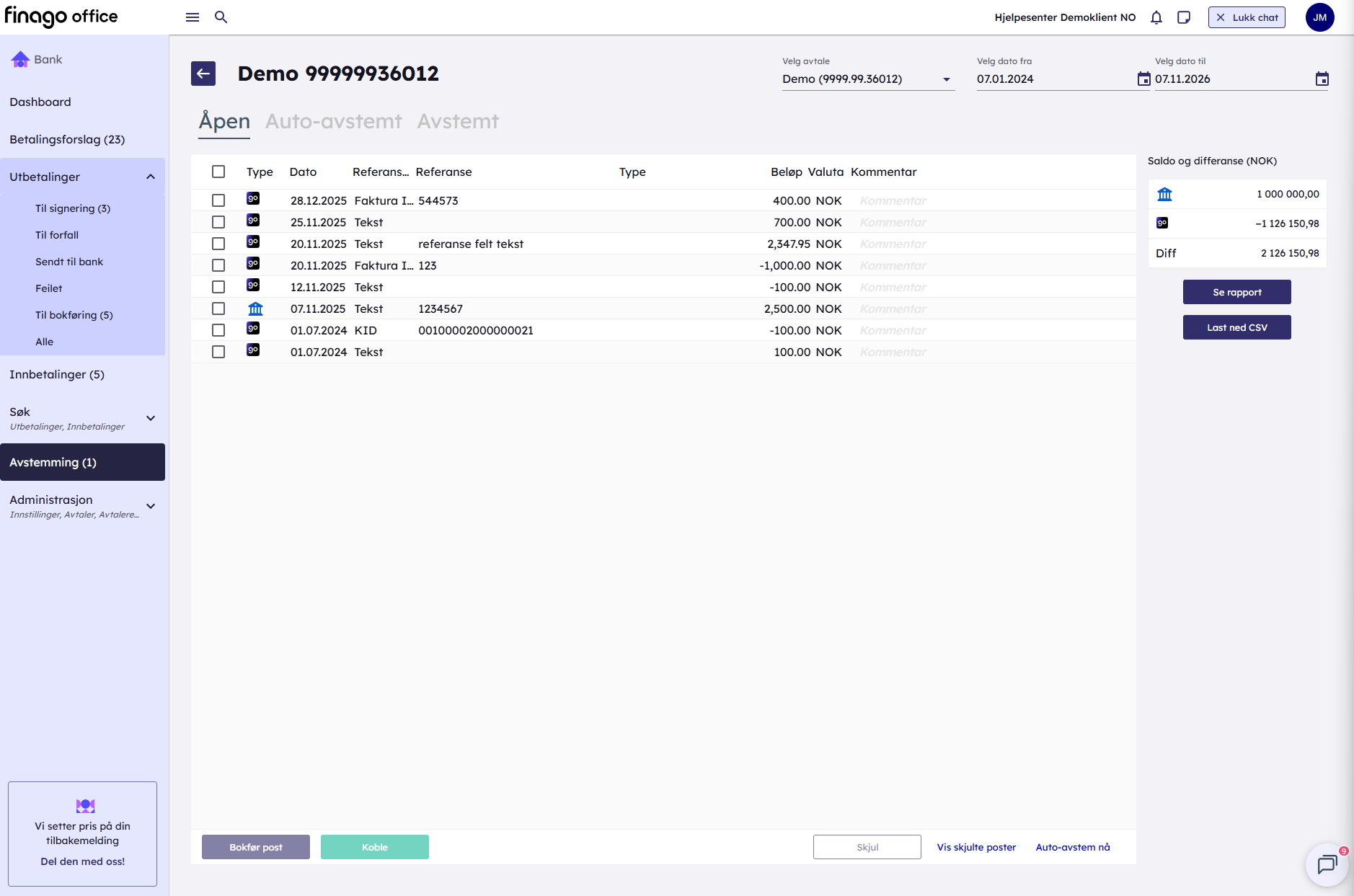 Bankpostene kommer inn i systemet når vi mottar avstemmingsfiler fra banken og systempostene legger seg i avstemming når transaksjonene blir bokført mot hovedbokskontro som ligger på bankavtalen.
