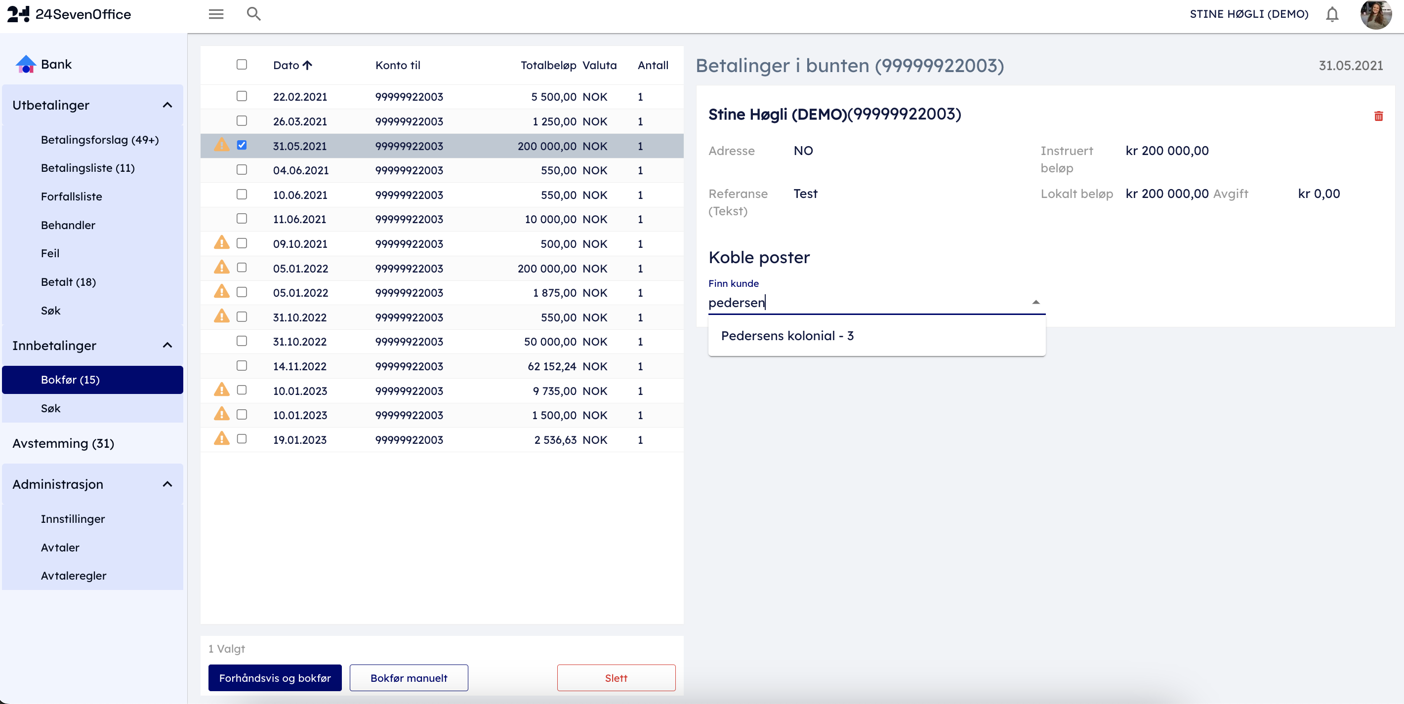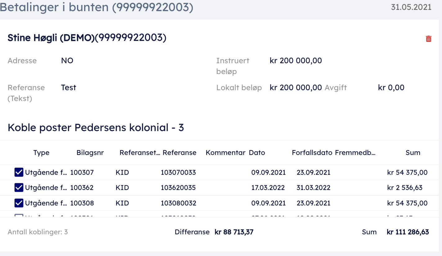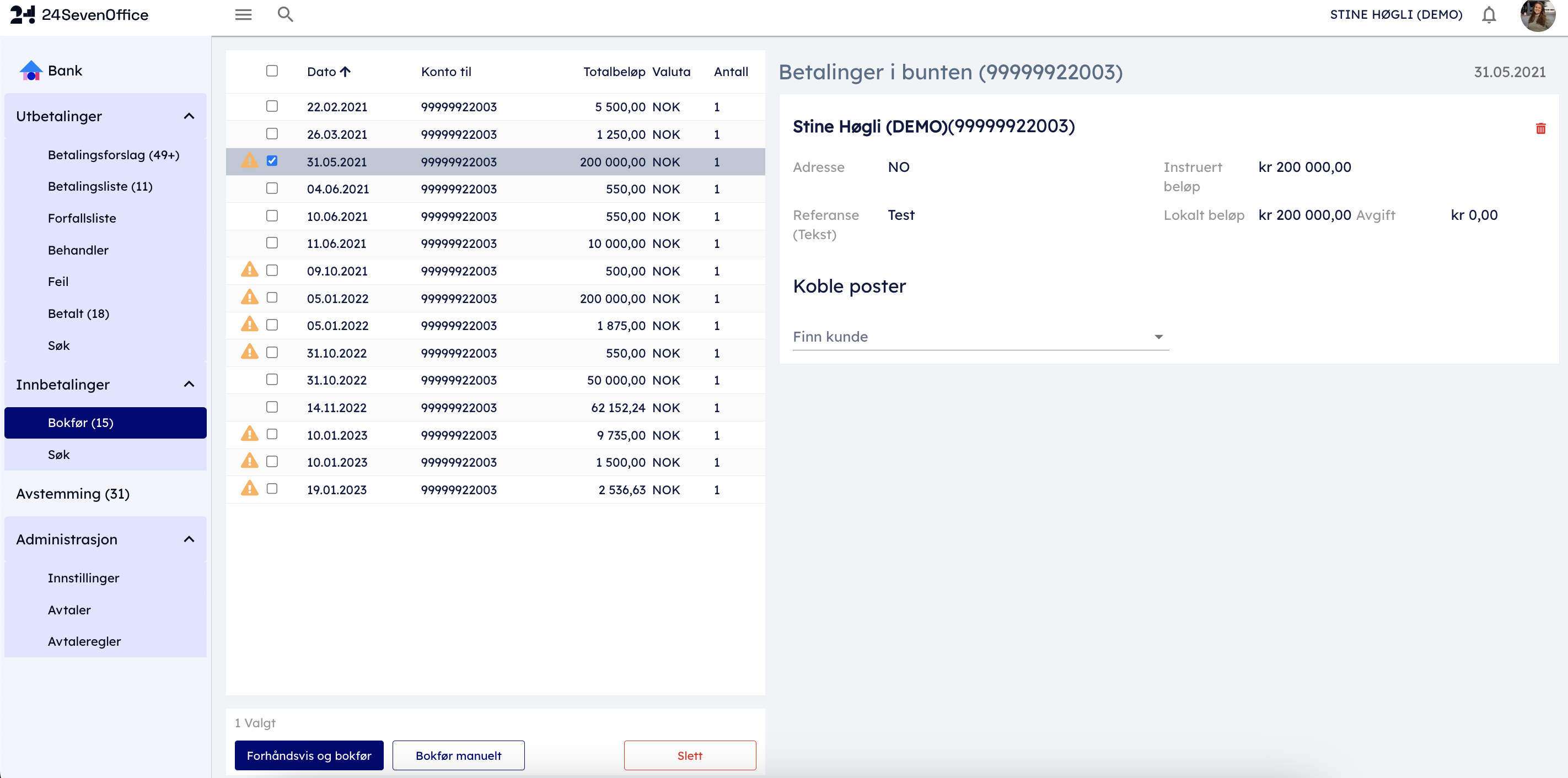 Hvis systemet allerede har funnet en kobling, vil ikke den gule varseltrekanten være der og innbetalingen er klar for å bokføres.