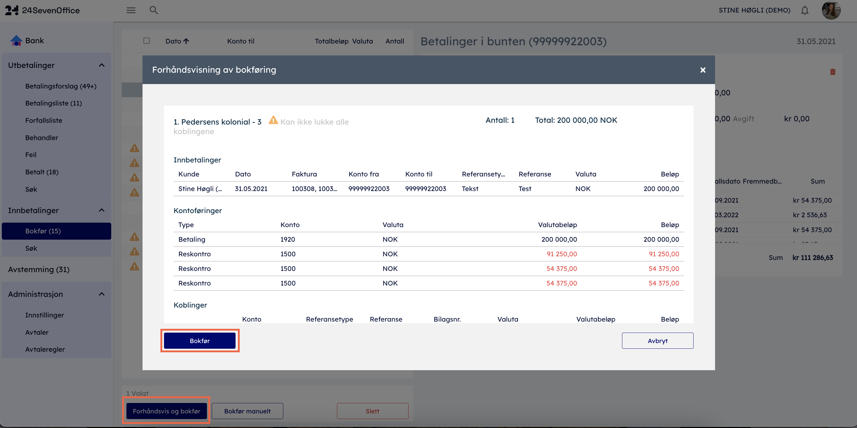 Dersom alt ser ok ut trykker du på bokfør knappen og innbetalingen bokføres.
