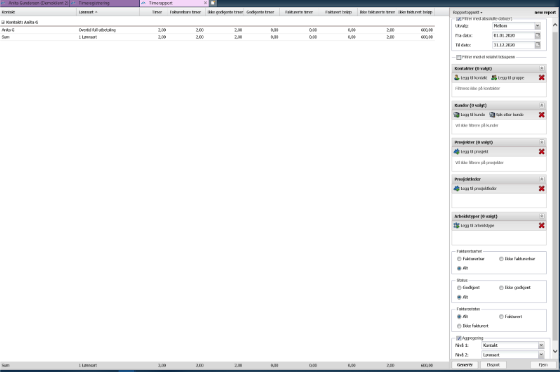 - Oversikt på det som er registrert finner du i timerapporten ved å velge periode, huke av på aggregering og velge nivå 1 kontakt(ansatt) og nivå 2 lønnsart. For å få bildet under her større høyreklikker du og velger Åpne bildet i ny fane.
