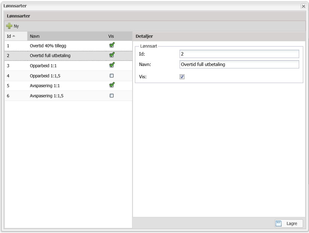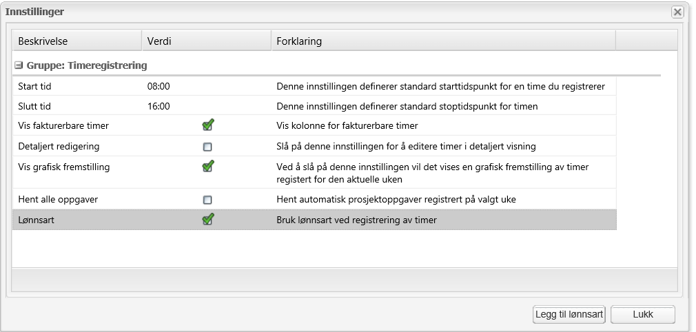 - I timemodulen under Innstillinger så kan man huke på bruk av lønnsarter ved timeregistrering. Dvs man kan bruke dette til å få oversikt på normaltimer, overtid, avspasering, sykefravær m.m. pr ansatt.