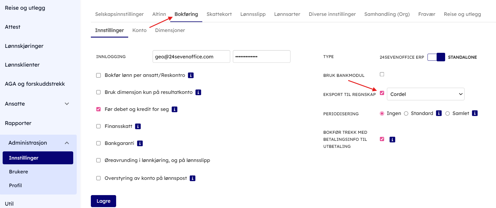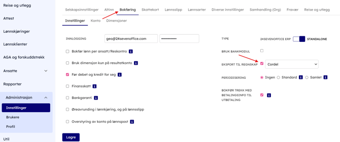 - For å få eksportert regnskapsbilag tilpasset Cordel, må man aktivere dette. Gå til Administrasjon → Innstillinger → Bokføring. Huk av for Eksport til regnskap. Velg Cordel og trykk lagre.