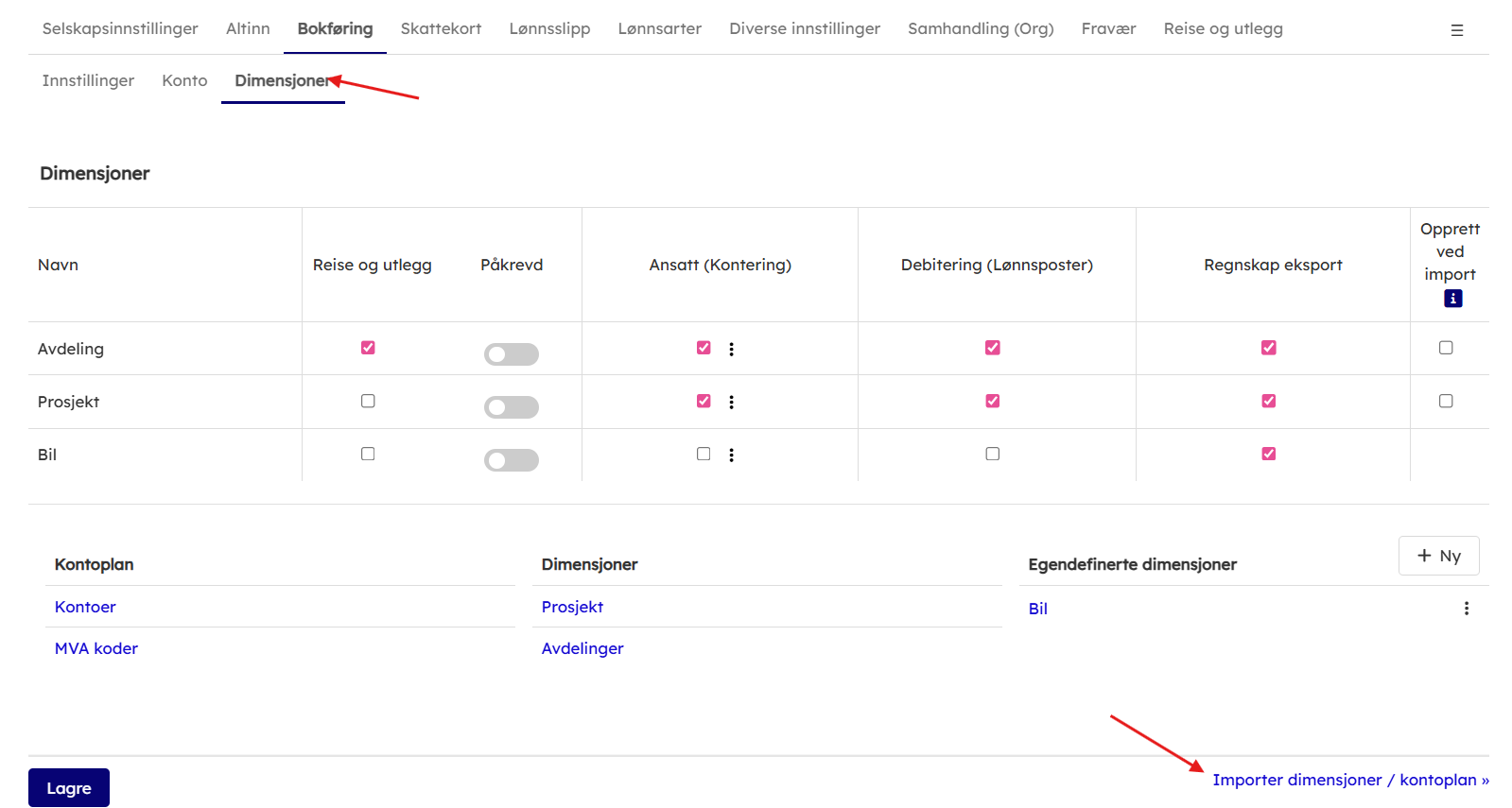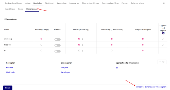 - Gå deretter til "Dimensjoner" under "Bokføring" for å opprette/importere kontoplan og avdeling om det benyttes.