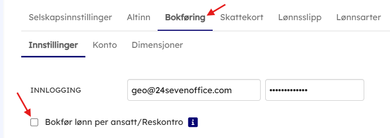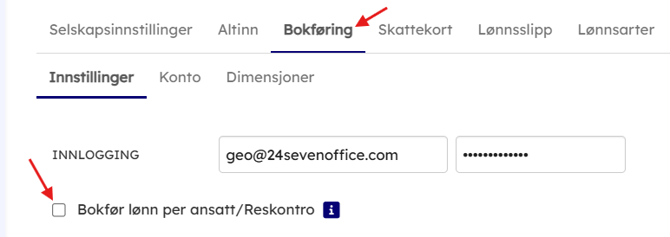 - Om utbetalingen ikke skal gå mot reskontro, men direkte mot bankkonto, må bankkonto settes som Bokføringskonto under Innstillinger → Bokføring → Konto. Eventuelt annen konto for skyldig lønn.