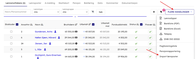 Når du står i fanen “Lønnsmotakere” i lønnskjøringen, trykk på “Flere handlinger" - deretter Import lønnsposter.