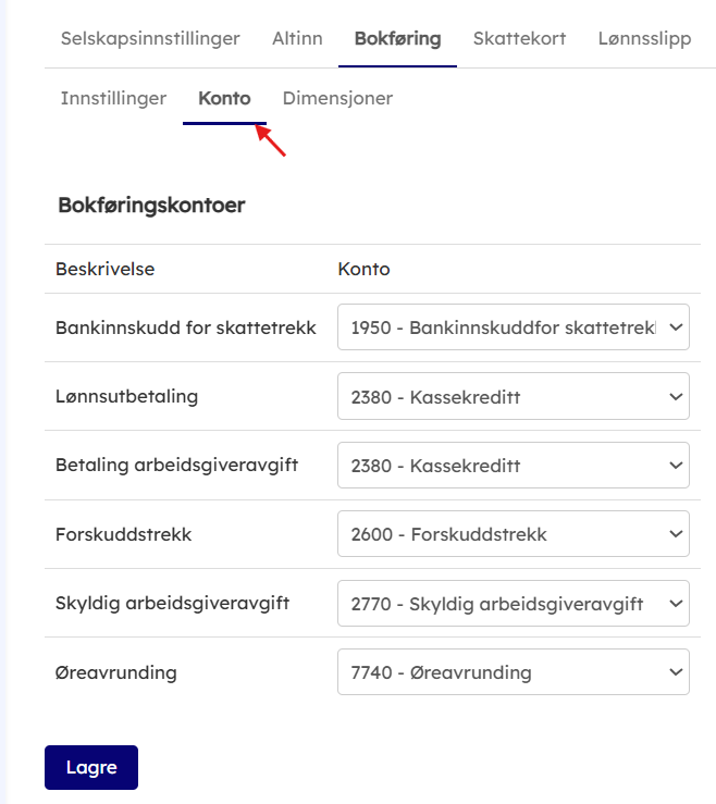 Pass også på at riktig Hovedbokskonto ligger inne på lønnsartene som benyttes.
