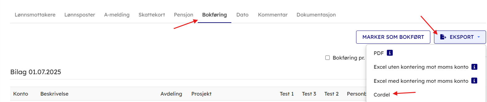 Gå til fanene “Bokføring” i lønnskjøringen → til Eksport → Cordel