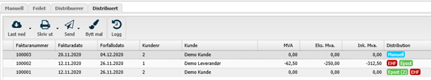 - viser til at faktura er distribuert manuelt. Denne er behandlet under fanen "Manuell", merket som manuell distribusjon.