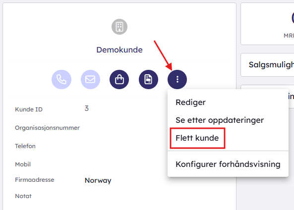- Du kan også klikke på de tre prikkene på kundekortet og velge "flett kunde"