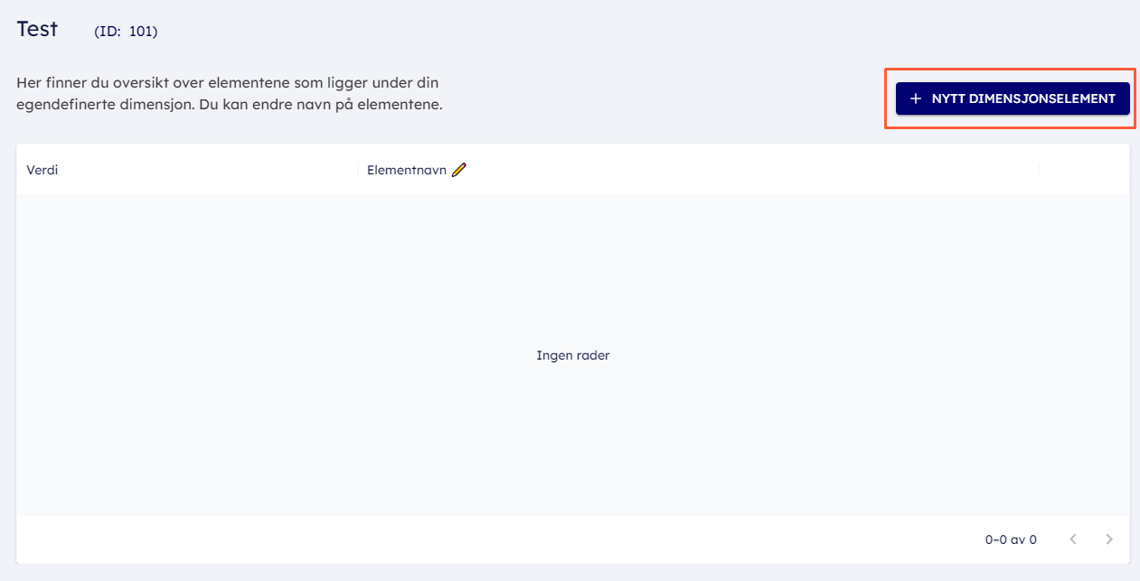 Du kan legge til elementer under en dimensjon, dette gjør du ved å klikke på ID på dimensjonen. Du kommer da inn i elementer og kan opprette flere elementer som tilhører dimensjonen.