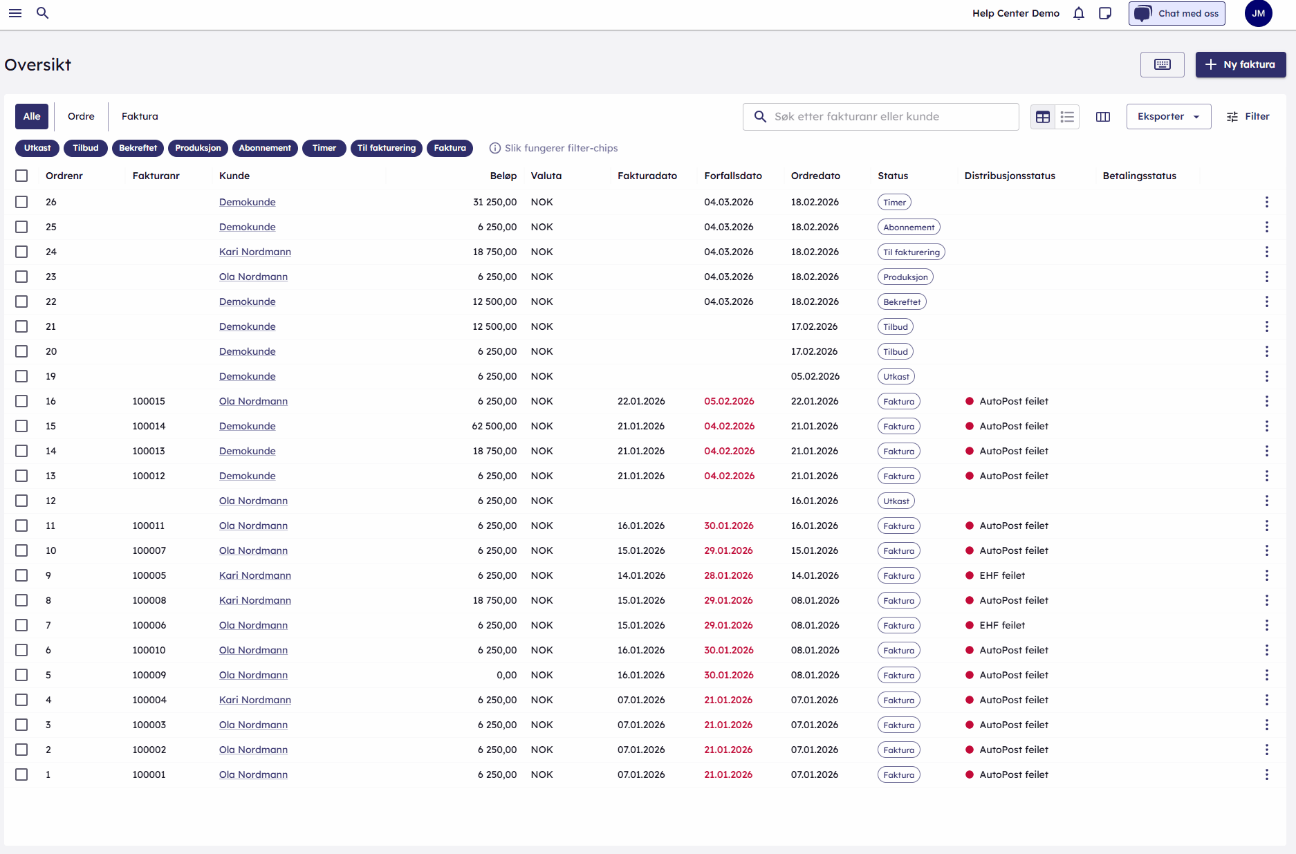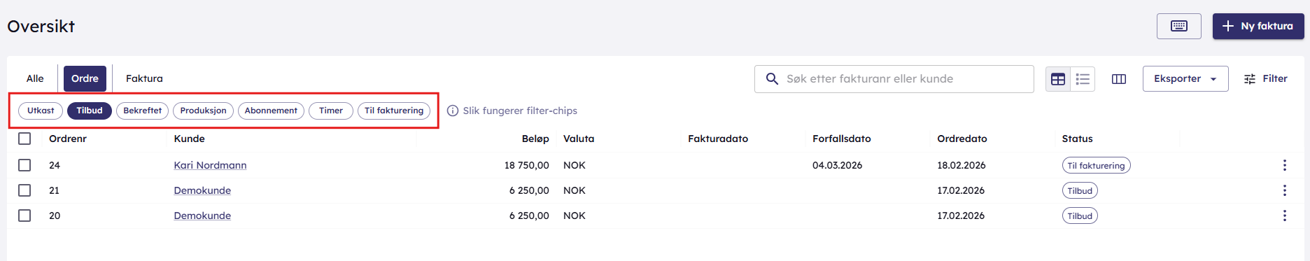 I Fakturaoversikt er det enkelt å skille mellom de ulike ordrestatusene som du ønsker skal være synlige. Nedenfor ser du en oversikt over alle ordre som er tilgjengelig.