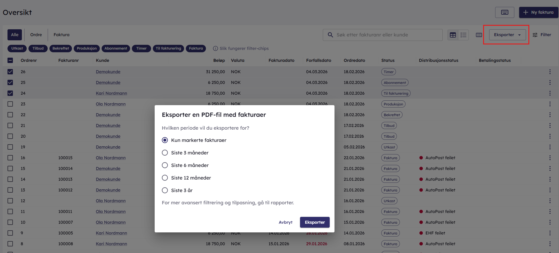 I Ny fakturering har vi gjort det enkelt å eksportere både ordre og faktura direkte i fakturamodulen. Dette øker effektiviteten ved å gjøre alt på ett sted. Her kan du enten velge mellom de du har markert eller ta ønsket datointervall.