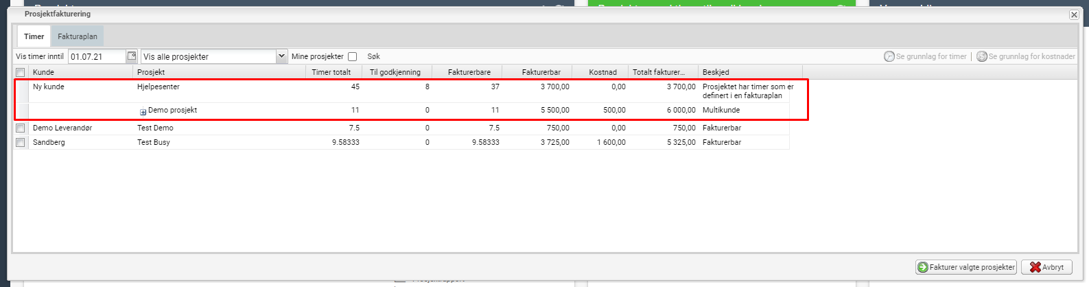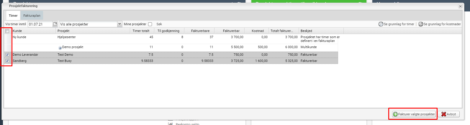 - Velg “Fakturer valgte prosjekter”
