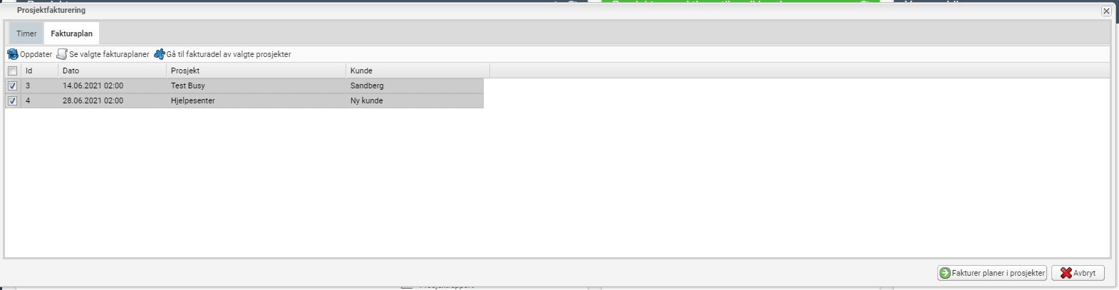 Huk av fakturaplanen du ønske rå fakturere og klikk på < fakturer valgte prosjekt> De vil da legge seg som en ordre i ordrelisten for videre behandling og fakturering.