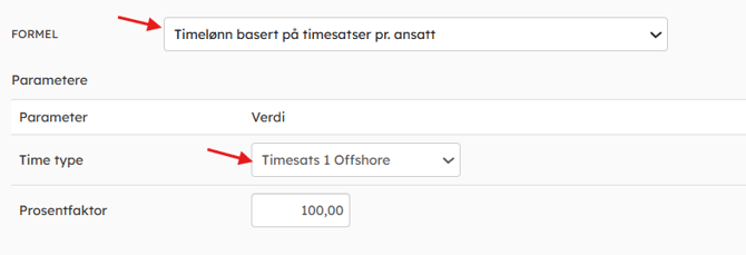 - Deretter må det opprettes lønnsarter som kobles til timesatsene. Gå til Innstillinger → Lønnsarter, kopier for eksempel lønnsart 101 Timelønn. Legg på formel Timelønn basert på timesatser pr. ansatt på lønnsarten. Da får du opp valget Parametere. Legg på parameter Time type, og hent opp riktig timesats type.