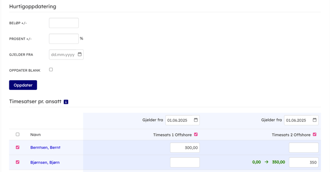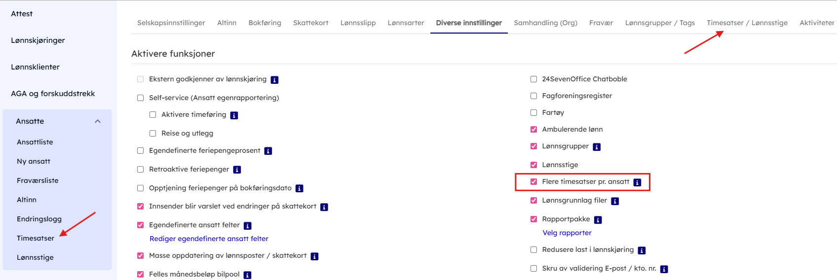 - For å aktivere flere timesatser pr. ansatt går til Administrasjon → Innstillinger → Diverse innstillinger og huk av for "Flere timesatser pr. ansatt".