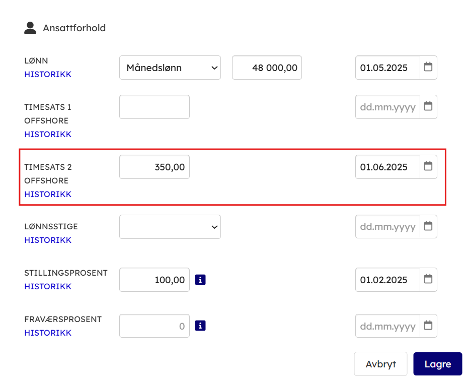 - Gå inn på ansattkortet → Ansattforhold → Lønnsinformasjon. Her vises oversikt over andre timesatser. Man kan også se historikk over endringer i satsene. Ved behov for å oppdatere sats kan det legges inn her direkte, med startdato.