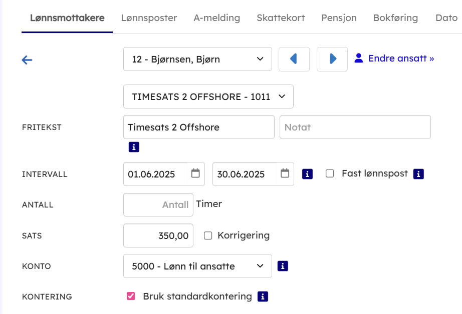 - Løsningen er nå klar til bruk, og kan legges på manuelt i lønnskjøring, under faste poster på ansattkortet eller importeres via timeimport.
